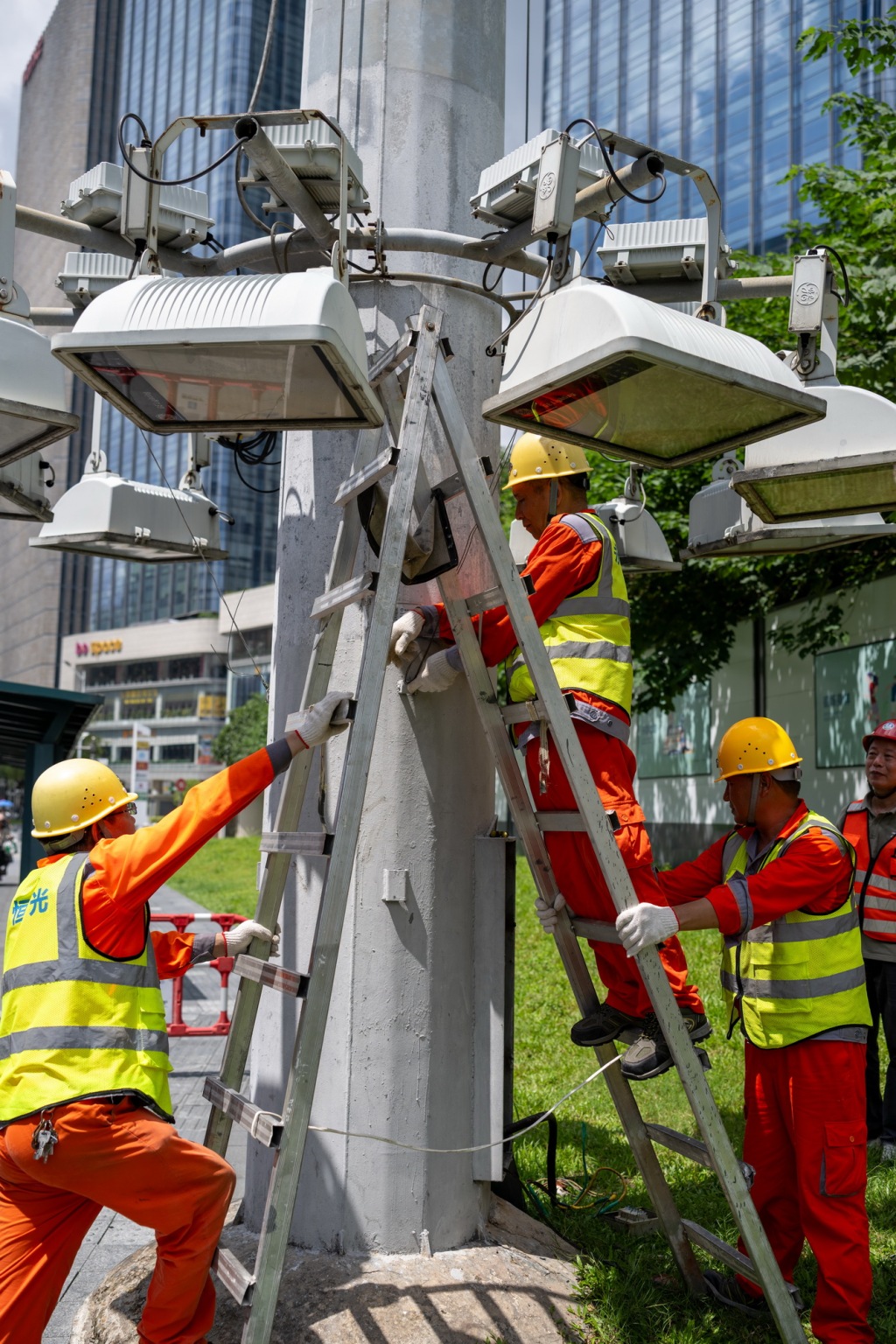 9月22日,深圳市容中心工作人员降下高杆灯并进行加固。