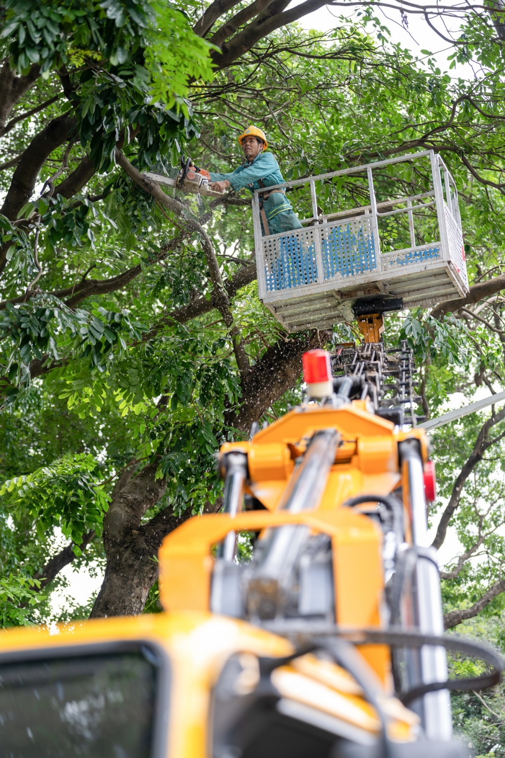 9月22日,在深圳北环大道,绿化工人修剪树木、排查安全隐患。
