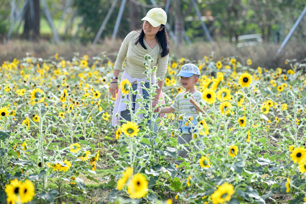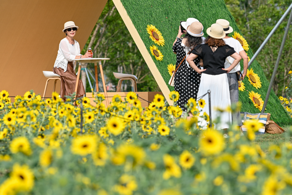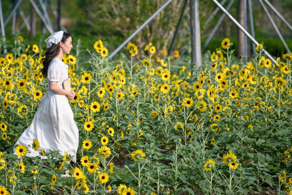 10月1日至10月12日,世博花艺生活节在上海世博文化公园的世界花艺园热闹开场。这里种植的2万多株向日葵随风摇曳,花盘在阳光下慢慢转向,演绎秋日浪漫。这片花海经过景观布局的设计后,花株高低错落,蜿蜒成带状的小径,游客行走其中,仿佛置身一幅立体的油画中。