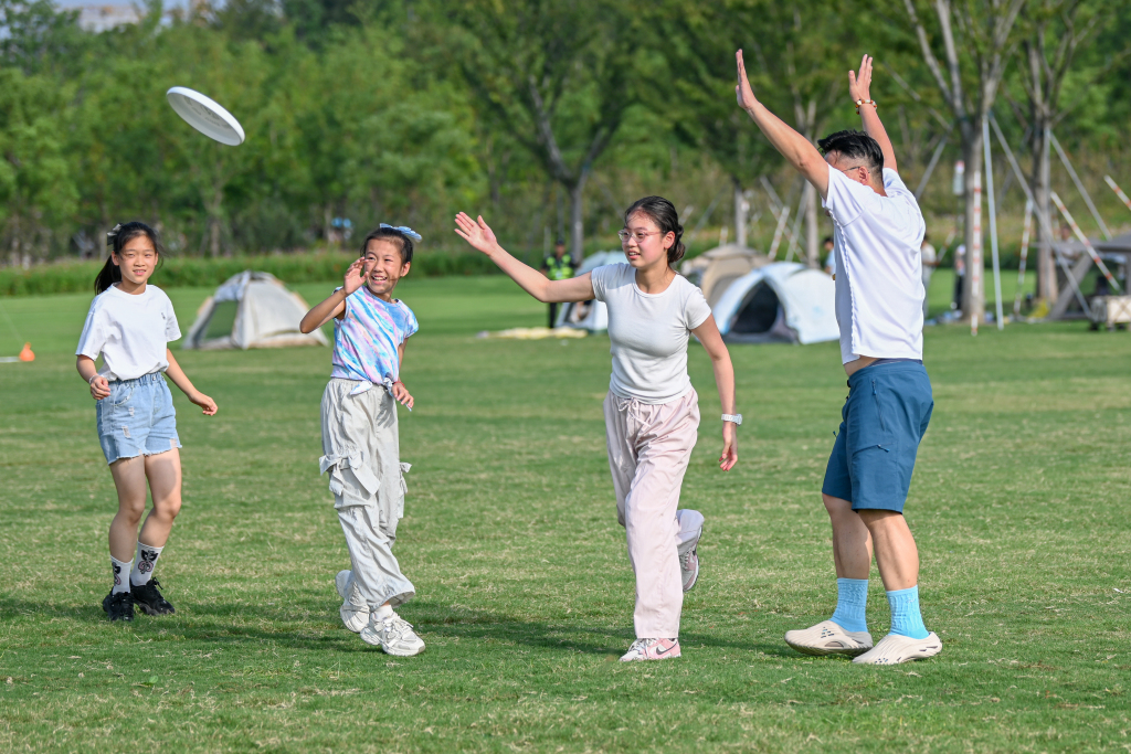 游客在星光草坪玩飞盘。澎湃新闻记者 朱伟辉 图