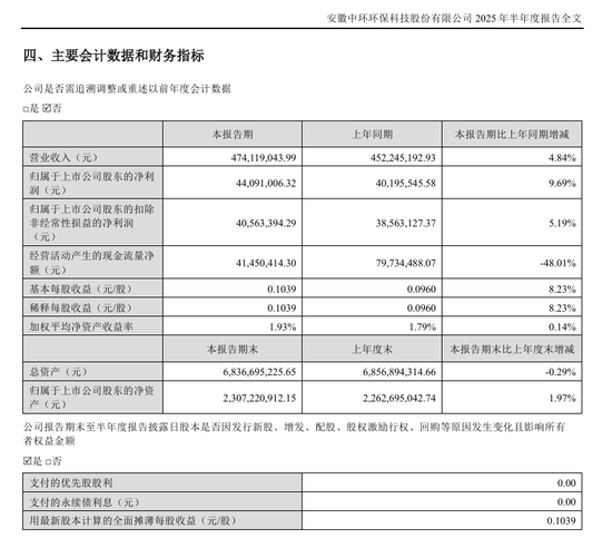 今年上半年,中环环保实现营业收入4.74亿元,同比增长4.84%;实现归母净利润4409.1万元,同比增长9.69%;实现扣非净利润4056.34万元,同比增长5.19%。