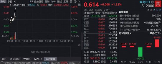 10月10日早盘,A股强势突破后回调震荡,三大指数集体低开,“旗手”券商异动力挺,300亿顶流券商ETF(512000)直线冲高,场内价格现涨1.32%,开盘不足半小时实时成交额已超5亿元,交投情绪高涨。