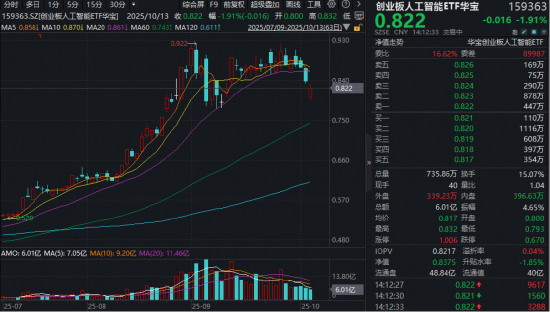 10月13日,受贸易摩擦升级等利空影响,A股大幅低开,以光模块为核心的海外算力陷入调整。光模块含量超51%的创业板人工智能盘中一度下探逾5%,现跌幅缩窄明显。成份股大面积飘绿,、跌超5%,、、等多股跌超2%,从日线上看,截至今日盘中“易中天”已四连跌。