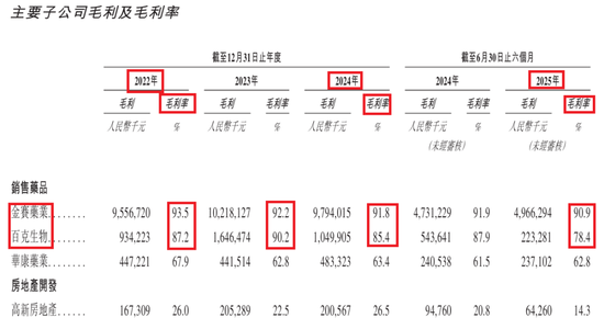 长春高新销售药品的毛利率从2022年的91.6%,持续下滑至2025年上半年的88.6%。