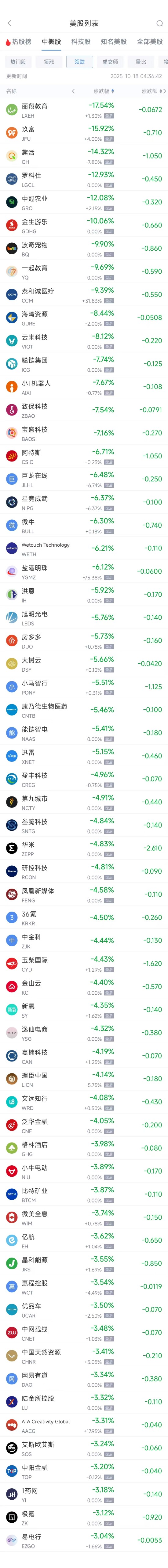 下跌股当中(按市值从高到低),跌1.59%,跌0.26%,携程跌0.07%,跌0.73%,跌1.19%,汽车跌0.27%,跌0.05%,小鹏汽车跌0.80%,跌1.17%,满帮跌0.08%,中国新城农村跌3.30%,跌0.88%,跌0.05%,跌3.12%,小马智行跌5.51%,名创优品跌1.34%,万国数据跌1.65%。