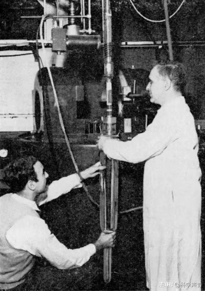 图:工作人员配合吴健雄在华盛顿特区的标准局低温实验室进行实验