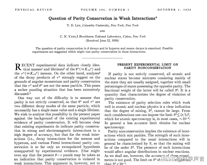 这是近代物理学史上最重要的论文之一,在这篇论文中,他们提出,在强相互作用和电磁相互作用中,宇称在很高的精度上是守恒的,但是在弱相互作用中,宇称守恒只是一个外推性的假设。甚至可以认为西桃之谜恰恰是弱相互作用中宇称守恒的反例。为了毫不含糊地确定在弱相互作用中宇称是否守恒,我们必须完成一个实验来确定在弱相互作用中左和右是否不相同。