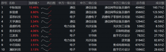 成份股方面,光模块三巨头领衔大涨,涨超10%,涨逾8%,涨超5%。消费电子龙头涨超5%,光伏龙头涨超4%,权重股涨超3%。