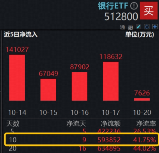 值得注意的是,资金面已呈现出明显增仓银行的态势。上交所数据显示,银行ETF(512800)近10日有9日获资金增仓,累计获资金净流入59.39亿元。