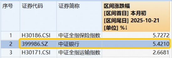 实际上,不只农业银行,10月以来整个银行板块都表现出明显的复苏态势,截至今日,银行ETF(512800)跟踪的月初以来累计上涨5.42%,涨幅在所有行业(中证全指二级)中位居第二位。