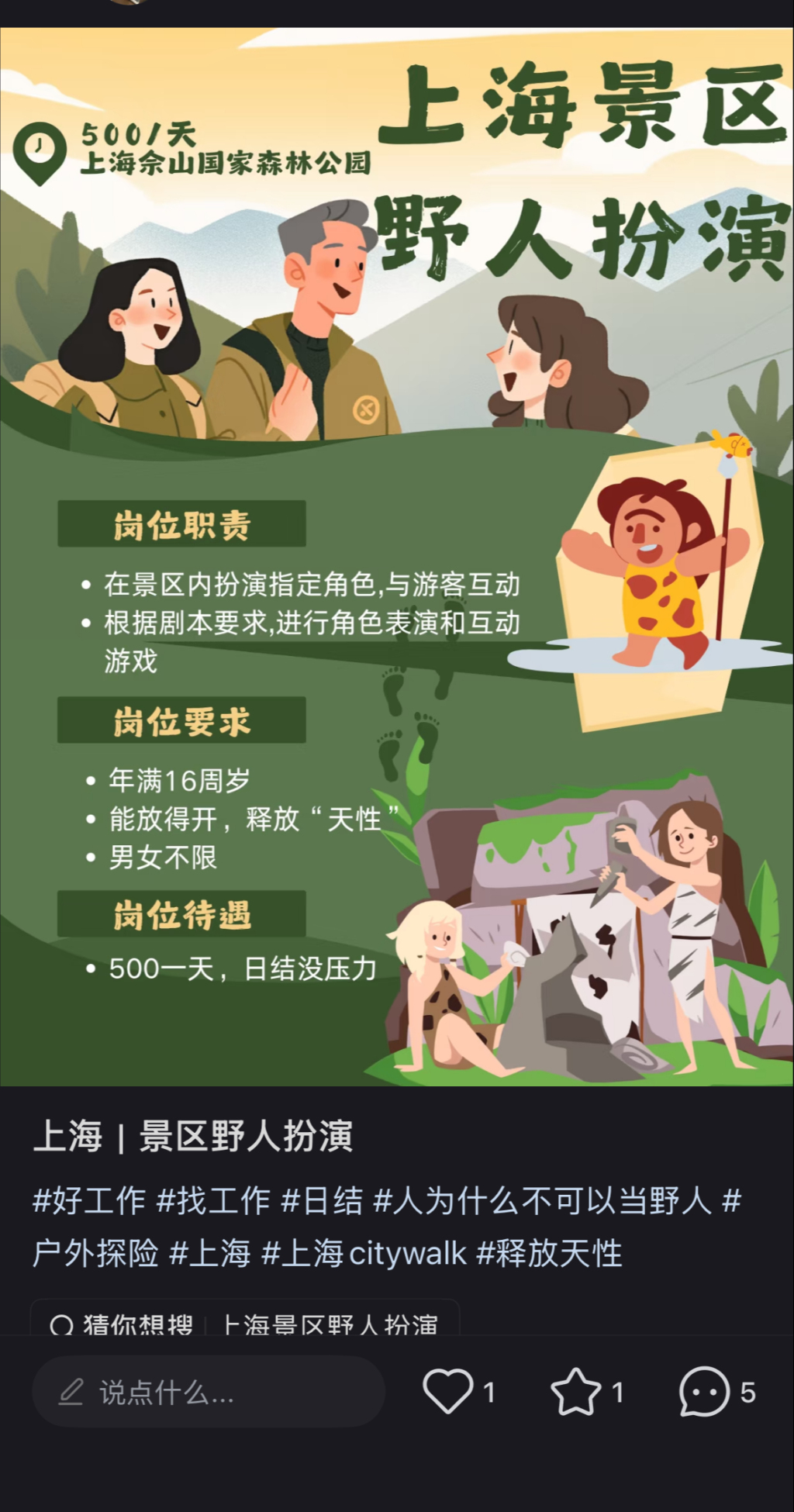 近日,社交平台上出现相似招聘帖文,称上海市松江区某景区招聘野人NPC,日结500元。其中,有帖文明确写明工作地点为上海佘山国家森林公园,不少网友在评论区留言索要报名方式。