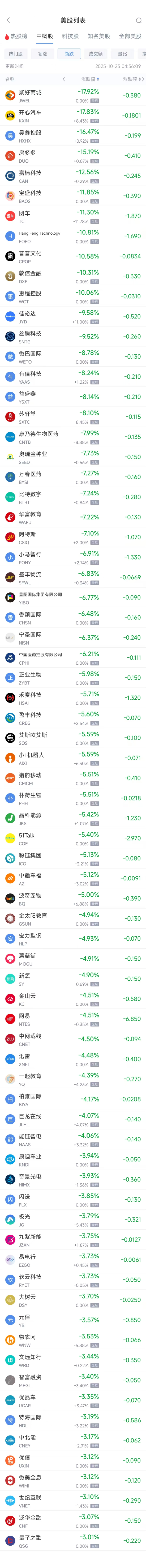 领跌中概股列表: