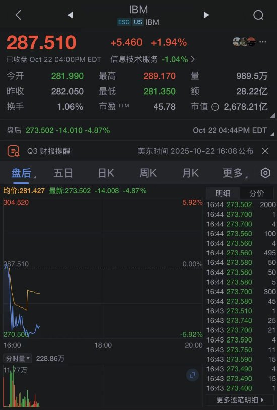 IBM 公布的第三季度业绩超出华尔街预期,并上调了业绩指引。该公司表示,这一表现得益于人工智能领域的持续利好,但在盘后交易中,其股价仍下跌了 5%。