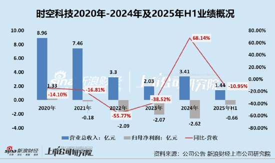 近年来,公司经营业绩十分不景气,至2025年上半年,时空科技已经连续亏损四年多。2020年-2024年及2025年上半年,公司的营收分别为8.96亿元、7.46亿元、3.3亿元、2.03亿元、3.41亿元及1.44亿元,分别同比变动-14.10%、-16.81%、-55.77%、-38.52%、68.14%及-10.95%;归母净利润分别为1.33亿元、-0.18亿元、-2.09亿元、-2.07亿元、-2.62亿元及-0.66亿元。