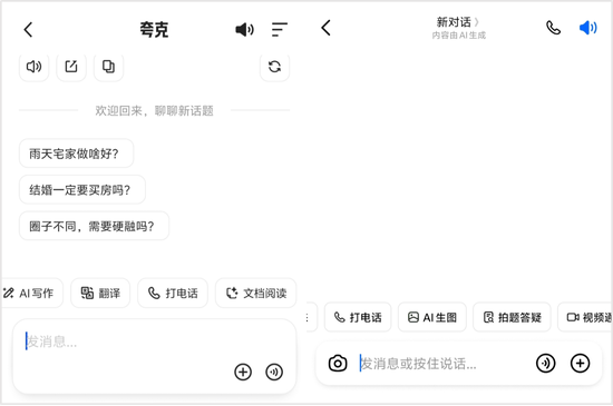 定睛一看,打电话、翻译、AI写作、文档阅读……这高度重合的功能布局,若没有顶部的“夸克”标识,还真让人误以为打开了豆包。