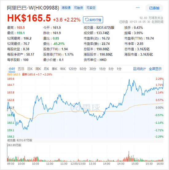 或受利好消息影响。截至10月23日,阿里巴巴港股报收165.5港元/股,涨2.22%,市值3.16万亿港元。