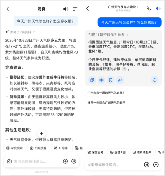 比如询问“今天广州天气怎么样?怎么穿衣服?”时,夸克助手的回答信息更细致,还扩展提供了生活建议;豆包则聚焦于天气与穿衣本身,风格更为精炼。