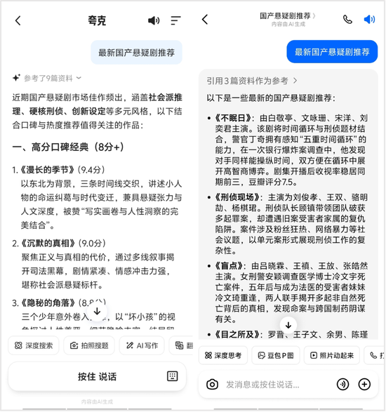 在“最新国产悬疑剧推荐”的问答中,夸克助手按照高分口碑经典、2025年新作、创新题材与社会议题、待播与潜力爆款分类推荐了12部,而豆包仅盘点推荐了6部。