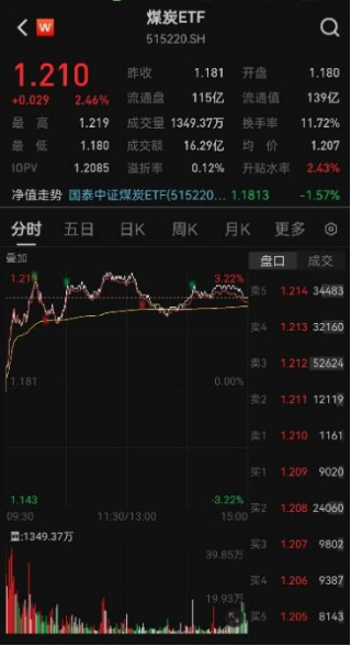 煤炭板块持续保持强势,煤炭ETF开盘逆势上行后企稳,收涨2.46%。