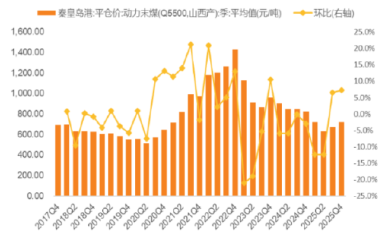 价格端,近期动力煤价格上涨明显。截至2025年10月17日,秦皇岛港Q5500动力末煤价格748元/吨,周环比大涨43元/吨,2025Q 4以来秦港Q550 0动力煤均价721元/吨,环比+7.2%。