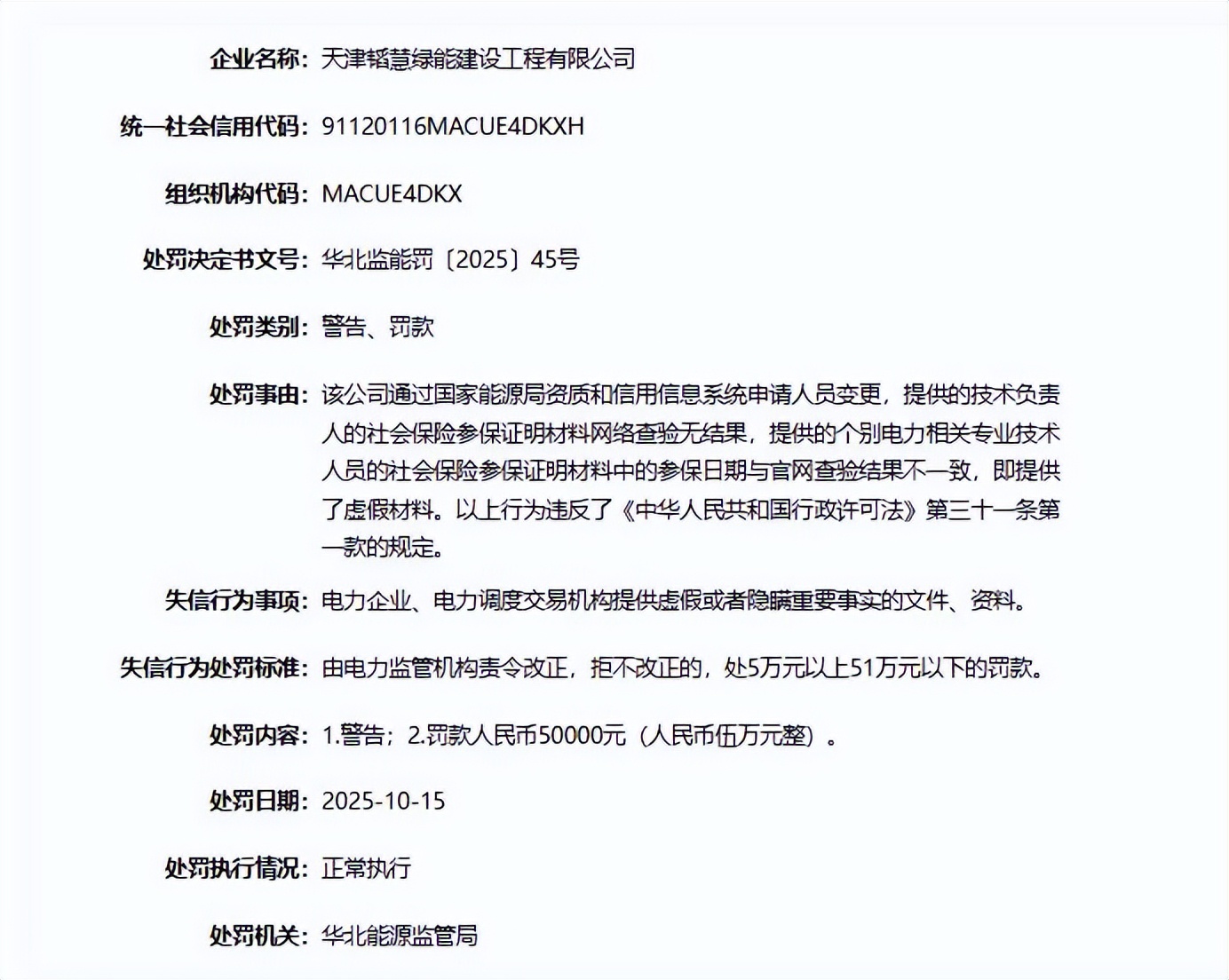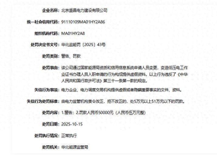 近日,国家能源局华北能源监管局发布关于对北京盛昌电力建设有限公司、天津韬慧绿能建设工程有限公司以及中绿能(天津)建设集团有限公司等单位行政处罚的信息。