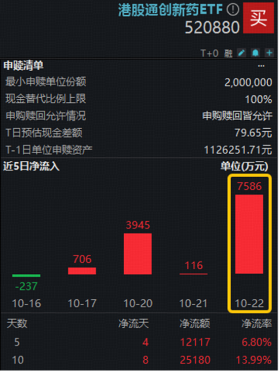 这只ETF也是全市场首只跟踪该指数的ETF,截至9月底,基金规模18.06亿元,上市以来日均成交4.93亿元,在同指数ETF中规模最大、流动性最优。近期港股通创新药二级市场走低,但资金多日净流入,昨天该ETF单日净流入7586万元,至此连续4日资金净流入,金额合计超1.23亿元。