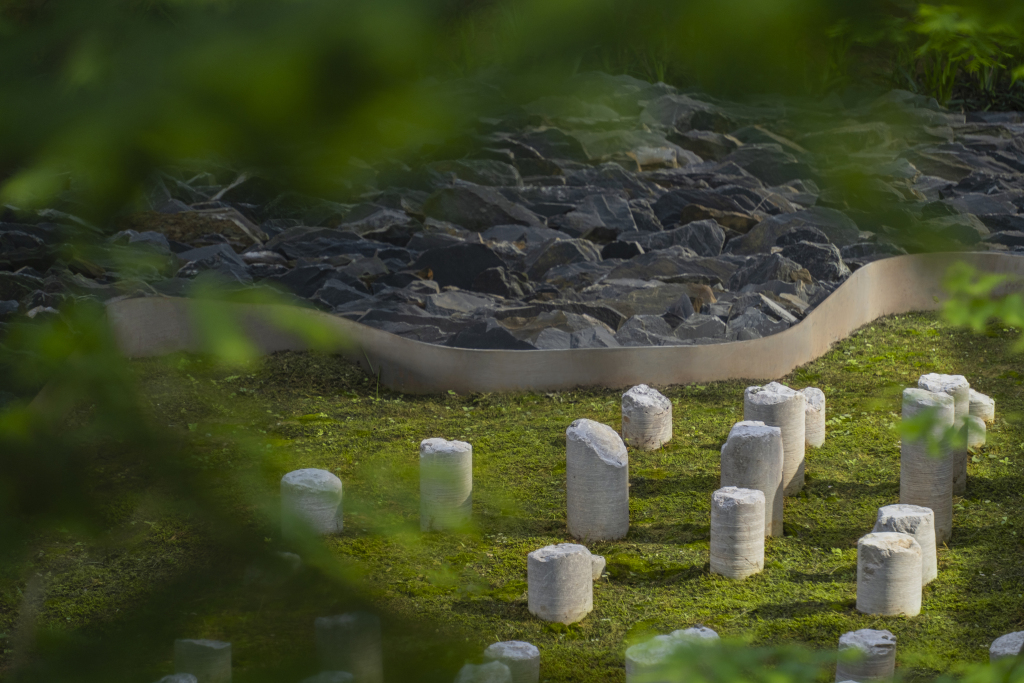 施工期间,打桩机进行土地勘测时产生的石柱并未当作建筑垃圾运走,而是被收集起来与园林融合造景,成为一道别致的景观。