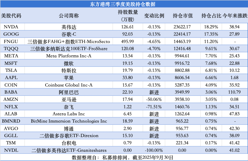 截至2025年三季度末,东方港湾的前十大重仓股仍以科技板块为主,其中英伟达、谷歌依然是其前两大重仓股,期末持股市值为2.36亿美元、2.24亿美元,两者合计占总持仓的35%;随后依次为FNGU(3倍做多FANG+指数ETF)、TQQQ(3倍做多纳斯达克100ETF)、脸书母公司META、微软、特斯拉、苹果、加密货币交易平台COINBASE和阿里巴巴,分别位列第二到第十大重仓股。