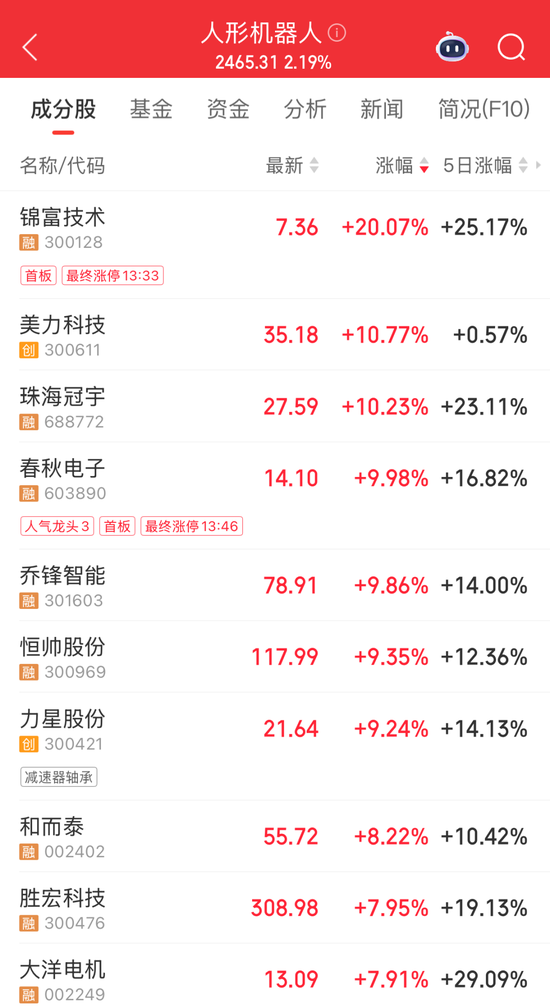 今日,人形机器人概念股走强,锦富技术“20CM”涨停,涨停,、涨幅居前。