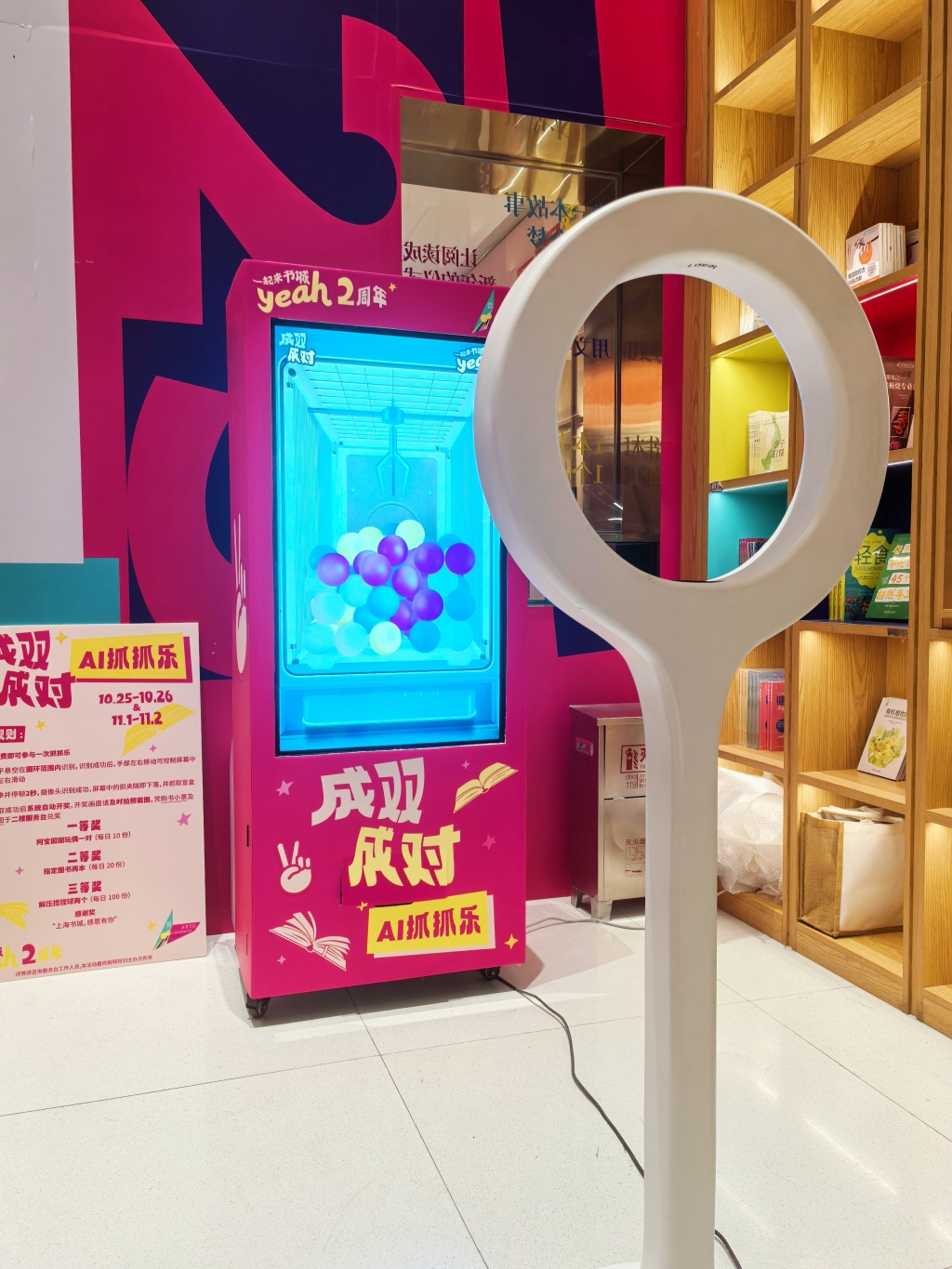 同期,上海书城2楼还将开展“成双成对”AI抓抓乐活动。读者凭当日(10月25日至26日及11月1日至2日)购书小票,即可免费体验,获取《繁花》文创潮玩“阿宝&囡囡玩偶”、神秘好书、悦读捏捏球等礼品。