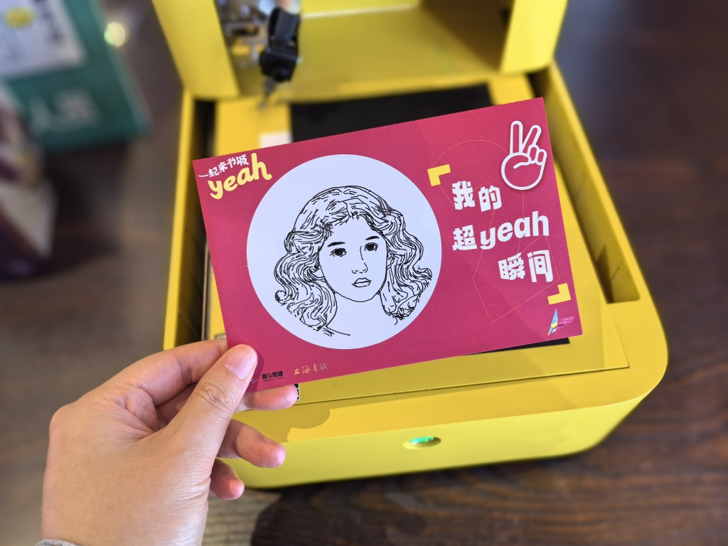 去年周年庆时,上海书城一楼曾推出读者留言墙,写满了读者们对书城的祝福。时隔一年,它将全新升级为“我的超‘yeah’瞬间”主题留言墙回归。10月25日至26日、11月1日至2日期间,读者可以通过留言墙边的AI画像机,绘制独属于自己和书城的AI自画像,粘贴在留言墙上,留下与书城的美好瞬间。