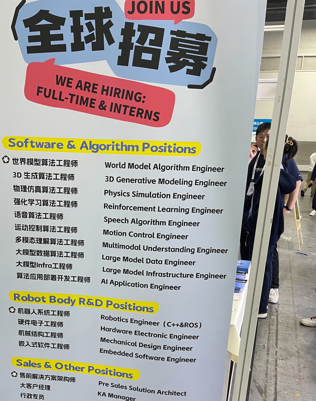 在展区,不少企业的展台前出现了手持简历的学生,简历上列满了与机器人相关的项目经历与技能。与此同时,多家企业的展板醒目标注“招募”字样,岗位涵盖从“模型算法工程师”到“机械结构工程师”等多个方向。字节、小米等企业也设有展台。小米展台的工作人员直言:“我们这次没有展示新技术,主要就是来招人。”