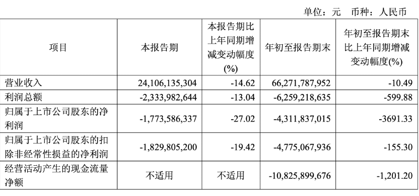 10月24日,广州汽车集团股份有限公司(广汽集团,601238)发布的2025年第三季度报告显示,公司在今年第三季度实现营业收入241.06亿元,同比下滑14.62%;归属于上市公司股东的净利润为-17.74亿元,同比下滑27.02%;基本每股收益-0.17元。