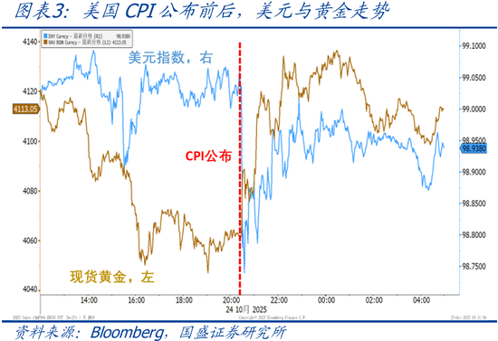 >大类资产表现:CPI公布后,美股上涨,美债收益率和美元指数先降后升,黄金走高。截至10/25收盘,标普500、纳斯达克、道琼斯指数分别上涨0.8%、1.2%、1.0%,10Y美债收益率基本收平为4.01%,美元指数基本收平为98.94,现货黄金下跌0.4%至4111.6美元/盎司。