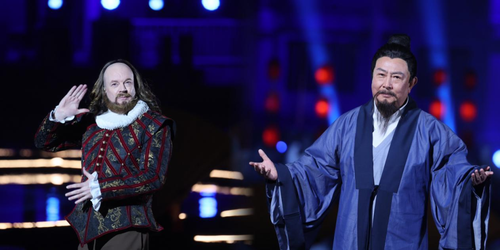 晚会以“十年文明互鉴路,牡丹新声世界听”为主题,也着力呈现了东西方文化的情感共鸣。由昆曲名家柯军与英国导演Leon Rubin联合创排的戏剧《汤莎会》,让《牡丹亭》和《罗密欧与朱丽叶》同台相遇,展现东方“至情”与西方“挚爱”的精神契合;《友谊地久天长》由多国艺术家联袂演唱,传递跨越地域的真诚情谊;歌剧《今夜无人入睡》以磅礴声线将现场气氛推向高潮;戏曲创演《百戏芳华》融合锣鼓经与昆腔,展现中国戏曲丰富的舞台语汇;晚会尾声,中英歌手与台上演员共同唱响主题曲《我在牡丹亭等你》,以艺术为桥,寄望文明互鉴、心灵相通的未来愿景。