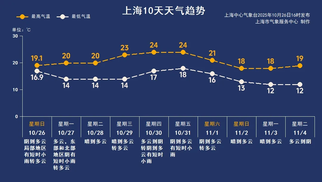 10月26日,澎湃新闻记者从上海市气象服务中心获悉,下周总体雨水少,阳光居多,前半周可安排洗晒,冷空气在周末准时“踩点”。