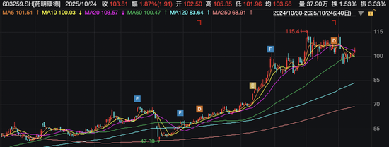 今年以来,医药股整体表现强势,在此背景下,药明康德股价亦大幅攀升,年内自地点最高涨幅超过140%。截至最新收盘日,公司A股股价报103.81元/股,总市值超过3000亿元。