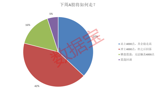 对于下周A股走势,有460多位受访者票选了“站上4000点,并企稳走高”,占比37%;有超过510位受访者认为A股将“冲上4000点,但之后回落”,占比42%。也就是说,认为下周A股有望站上4000点的受访者占比合计79%,其余21%的受访者对A股冲击4000点表示不看好。