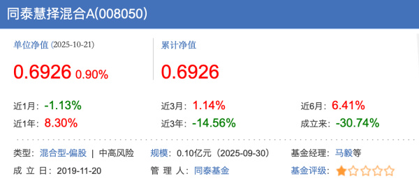然而,重仓押注带来的后果是该产品业绩表现持续承压。以同泰慧择混合A为例,截至2025年10月21日,产品成立以来累计下跌30.74%。尽管近六个月和近一年分别实现6.41%和8.30%的涨幅,但拉长时间看,其近三年收益率为-14.56%。