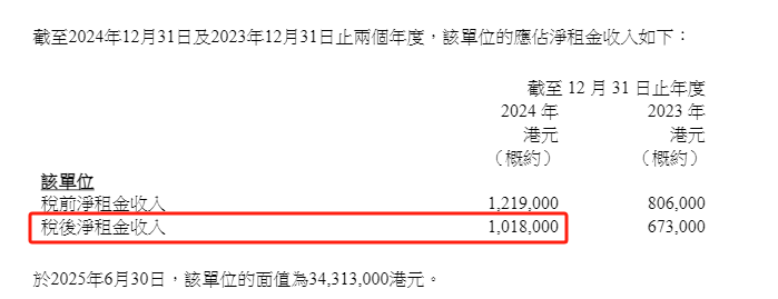截至2025年6月末,标的物业估值为3431.3万港元,2024年度税后净租金收入101.8万港元,相较于2023年度的67.3万港元同比增幅达51%,当前处于空置状态。