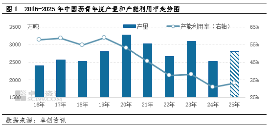 2020年之前,中国沥青产能利用率始终保持在50%以上,但近五年,由于沥青产能的投产速度明显大于需求增加幅度,导致沥青产能利用率呈现明显的下滑走势,2025年沥青产能率为33.23%,虽然同比提升2.17个百分点,但整体仍处在偏低位水平,沥青产能维持严重过剩的局面。