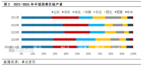在过去的五年里,中国沥青产量最大的五个区域始终是山东、华东、华北、华南和东北地区,这五个地区的沥青产量之和占全国沥青总产量的比例超过85%。但是,受到沥青产能投产、原料政策变化等相关因素影响,部分区域沥青产量变化较大:其中山东地区沥青产量呈现先增后减趋势,21-23年,受地方炼厂沥青产能持续增加影响,地方炼厂沥青产量创历史高位,24年原料贴水上涨导致地炼沥青生产长时间处于亏损状态,山东沥青产量大幅减少,25年消费税低扣政策调整迫使地炼加工生产利润,利润情况明显改善后促进沥青产量再次反弹;华东沥青产量整体呈现稳中下滑走势,一方面原料政策调整导致华东地方炼厂因成本增加、利润亏损而长时间停工,加之主营炼厂渣油加氢等装置投产后分流沥青产量,导致华东沥青产量逐年下滑;华北沥青产量呈现先增后减趋势,21-24年河北沥青产能持续增加带动沥青产量逐步走高,但随着原料端消费税相关政策的调整,25年河北沥青产量大幅减少;华南沥青产量在22年触底后逐步反弹,23-25年呈现增加趋势,揭阳石化、京博海南陆续投产,叠加24年底至25年京博海南原料瓶颈解决后沥青持续、稳定生产带动华南产量持续增加;东北沥青产量先减后增,东北炼厂加工低硫原料,渣油、保税等产品价值优于沥青,导致22-24年东北沥青产量逐步减少,但25年保税市场效益转弱,部分炼厂沥青排产增加带动产量触底反弹。
