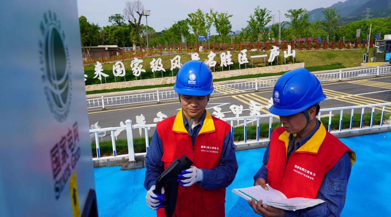 国网九江市濂溪区供电公司员工在庐山索道电动汽车充电站检查设备运行状况。黄家骏 摄