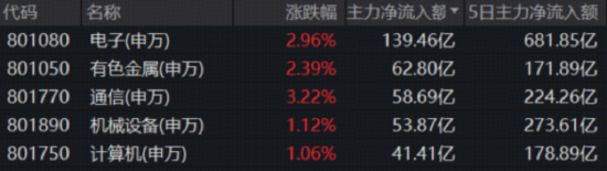 资金面上,高景气赛道股所在行业今日再度迎来主力资金青睐,电子、通信和计算机分别获得主力净流入139亿元、58亿元和41亿元,位居主力资金净流入榜前五!其中,电子板块近五个交易日获主力净流入681亿元,高居31个行业之首!