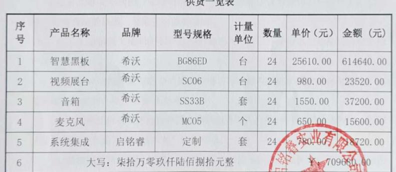 记者随后查询了一下陕西启铭睿实业有限公司的中标记录,发现在2024年8月西安高新区第十小学智慧黑板采购项目中,也有希沃BG86ED的项目报价,价格为25610元,数量为24台。
