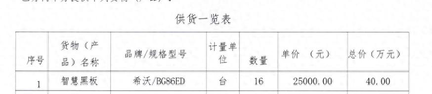 西西新闻记者查阅到,该采购包中,最贵的一项是型号为BG86ED的希沃智慧黑板,中标单价为25,000元,数量为16台。记者以私人名义联系到了希沃西安地区的代理商,了解到,此型号的智慧黑板带票价为14300元,相对于采购包中的报价,利润超过40%。