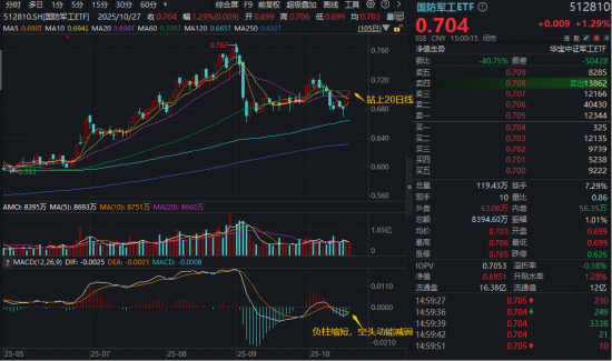 从国防军工ETF(512810)技术面来看,9月以来,尽管行情波动加大,但始终位于半年线上方,支撑有力,说明自年初以来的向上趋势或依然有效。
