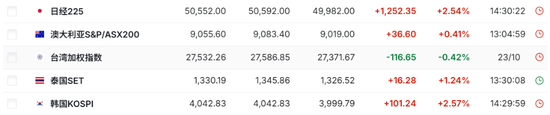 日经225指数收涨2.5%,报50512.32点。日本东证指数收涨1.7%,报3325.05点。韩国首尔综指收盘涨2.6%,报4042.83点。三星电子股价涨超2%,至纪录高位。澳大利亚S&P/ASX 200指数一度上涨0.7%。