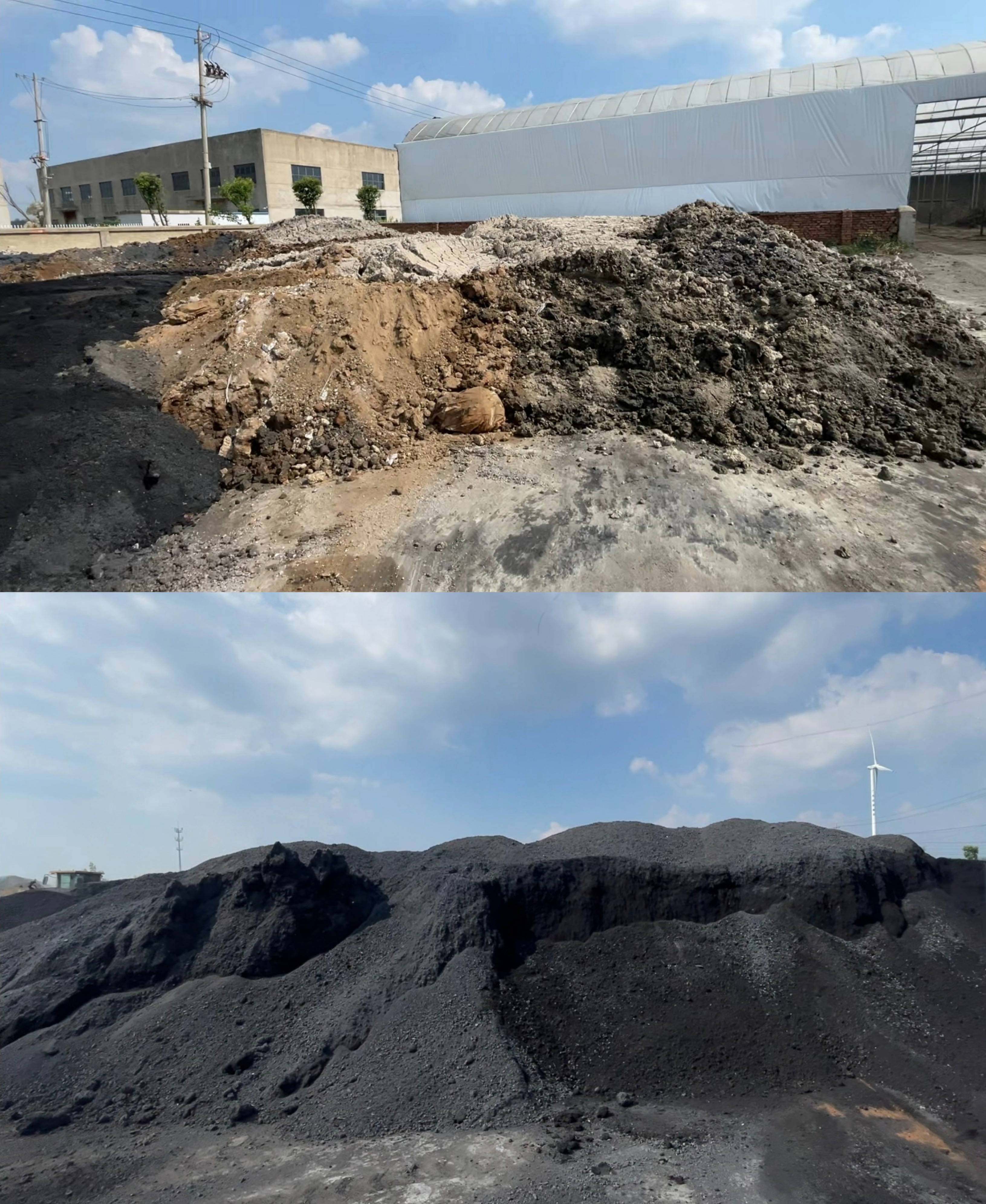 影子调查队在现场未见到任何无害化处置设备。厂里的简易大棚,堆放着各种棕黄、发黑的“营养土”原料、碎石;大棚后的一块空地,与旁边钢渣废料处理厂的空地相连,有挂车正在不远处卸炉渣;空地上同样露天堆着大量原料,未进行任何遮挡。