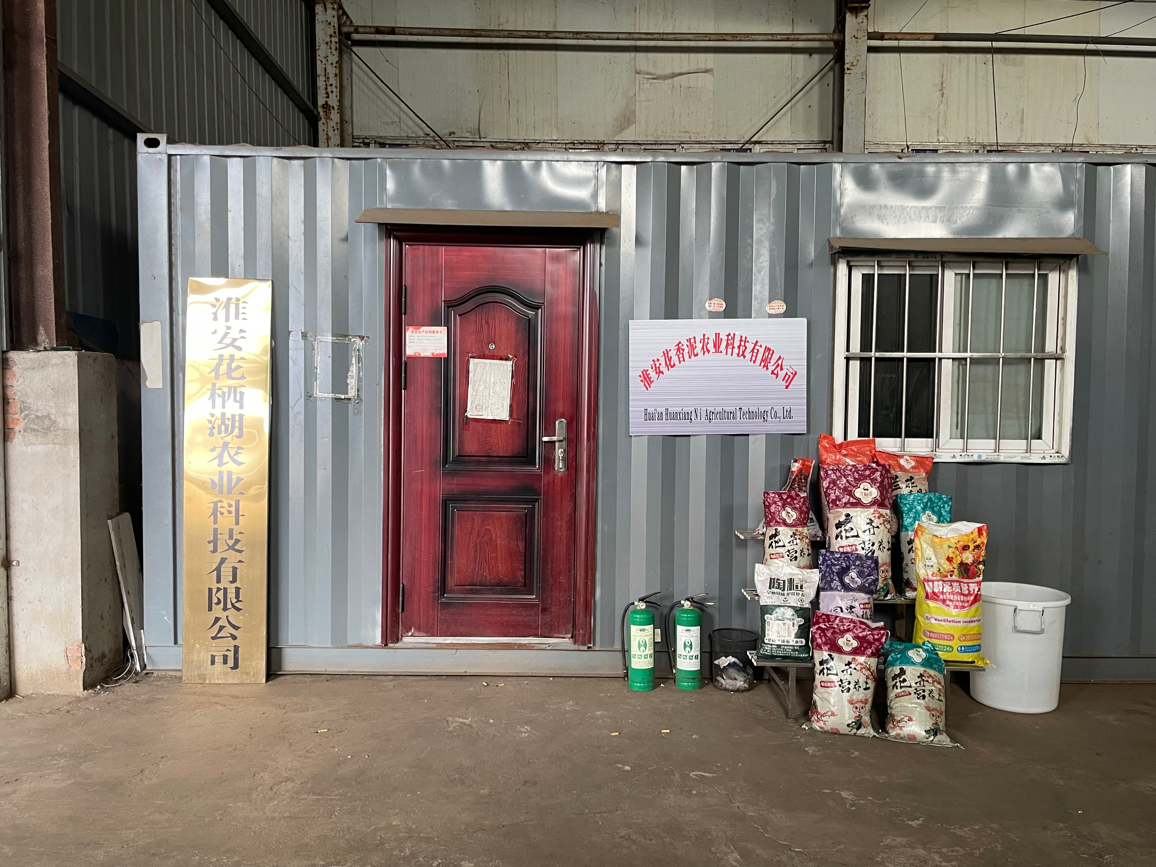 工厂尚未大规模生产,成品数量较少。未经任何遮挡,大量泥料露天堆放在外。厂房里的一间集装箱房,门口挂靠着“淮安花栖湖农业科技有限公司”和“淮安花香泥农业科技有限公司”两个牌匾。